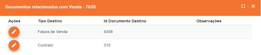 - Documentos Relacionados: Irá mostrar todos os artefatos gerados a partir desse pedido de venda. Como no exemplo abaixo, onde foi gerado uma fatura de venda e um contrato a partir desse pedido de venda e agora a Fatura de Venda e o Contrato constam como documento relacionado do Pedido de Venda.