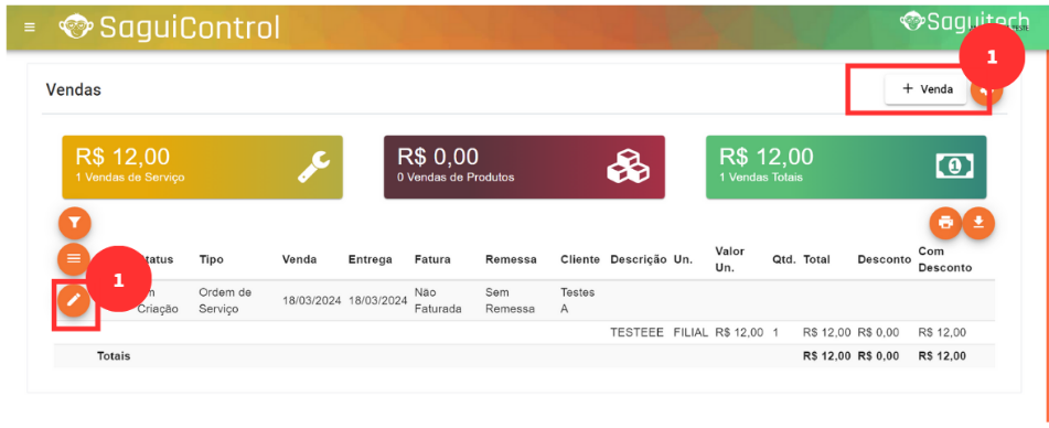 Para editar filtre o pedido de venda desejado e clique no botão com símbolo de lápis do lado esquerdo do pedido de venda desejado.