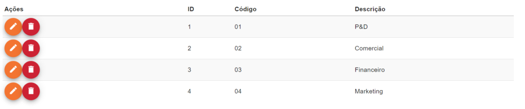 Todos os Departamentos filtrados na seção anterior, serão listados nessa tabela de acordo com o filtro configurado. Então, por exemplo: Se você pedir pra trazer todos Departamentos inativos, apenas Departamentos que correspondem a essas características serão listados.
