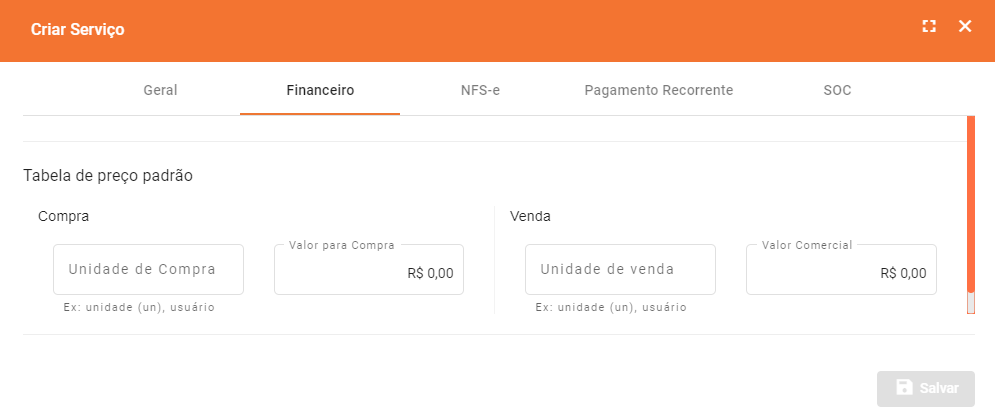 - Unidade de Venda: Especifique a unidade de medida do serviço quando é vendido comercialmente, por exemplo, “unidade”, “hora”, “quilograma”, etc.
