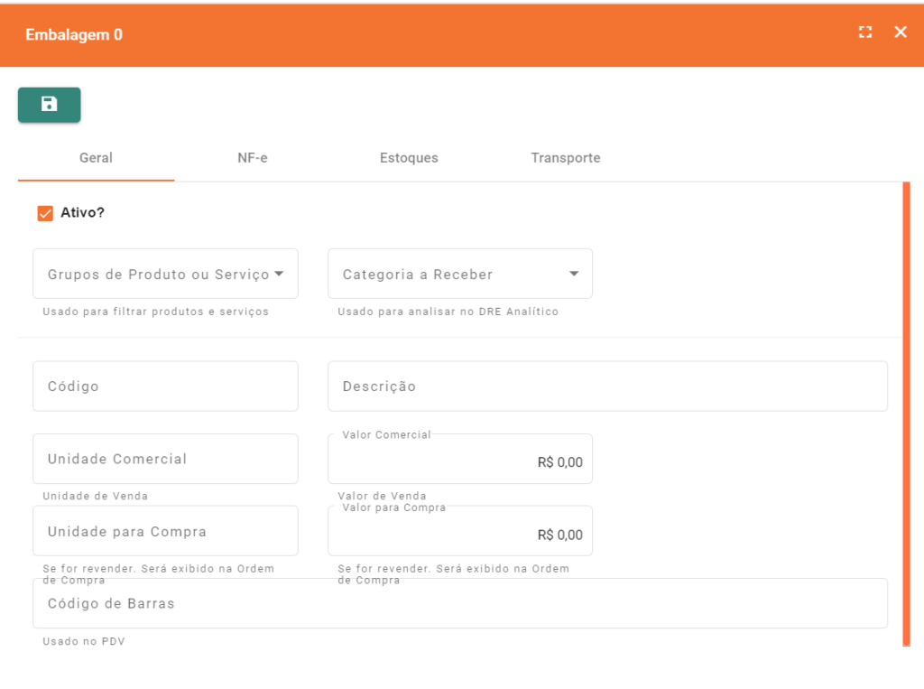 - Ativo?: Para indicar se a Embalagem está ativa ou não;