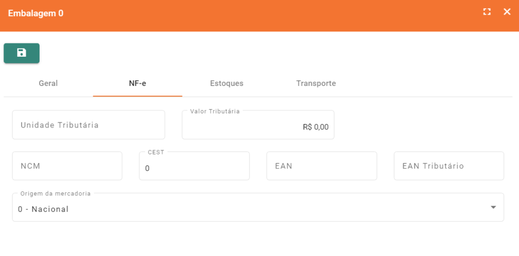 - Valor Tributário: Insira o valor tributário padrão para esta Embalagem na nota fiscal.