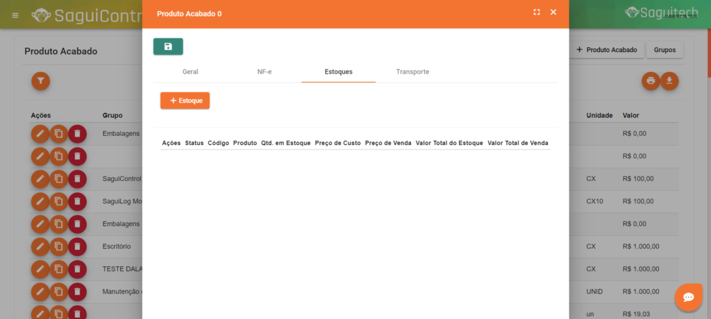 Caso opte por criar um estoque a partir da criação de um produto, clique no botão “+ Produto Acabado”