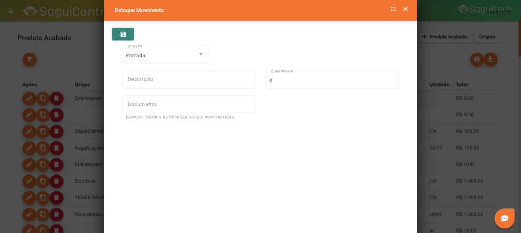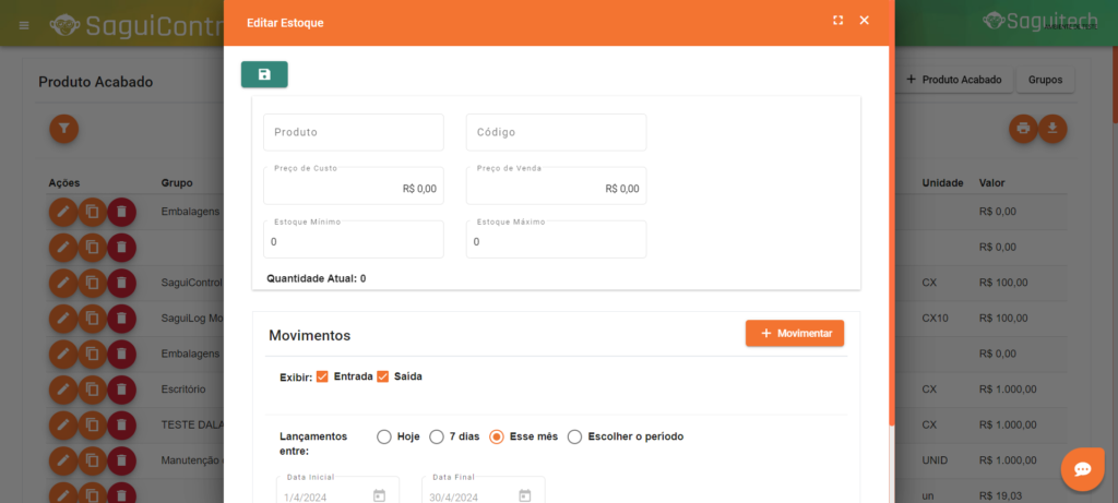 🔎 Caso tenha alguma dificuldade com a adição de Movimentos em Estoque, acesse o artigo: Como criar um Movimento de Estoque no Saguicontrol