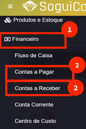 No menu principal do SaguiControl, navegue até a seção de “Financeiro” > “Contas a Receber“ ou “Financeiro” > “Contas a Pagar“