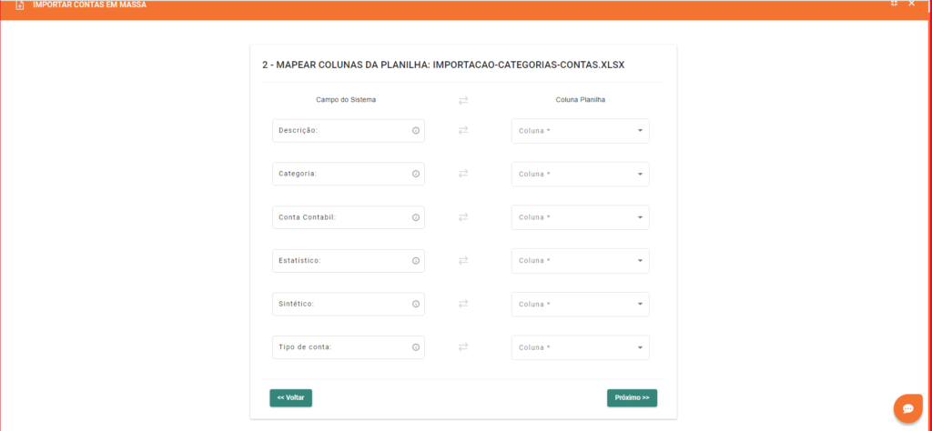 Ao clicar em próximo será aberta a etapa de Mapeamento das Colunas. Aqui será necessário informar qual coluna da sua planilha corresponde ao campo do sistema. Campos: