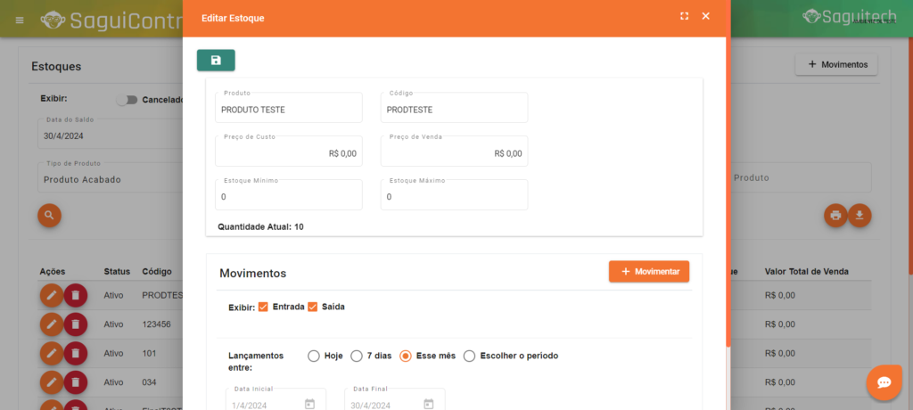 - Movimentos: Neste bloco você encontrará todo histórico do estoque, incluindo um filtro para períodos;