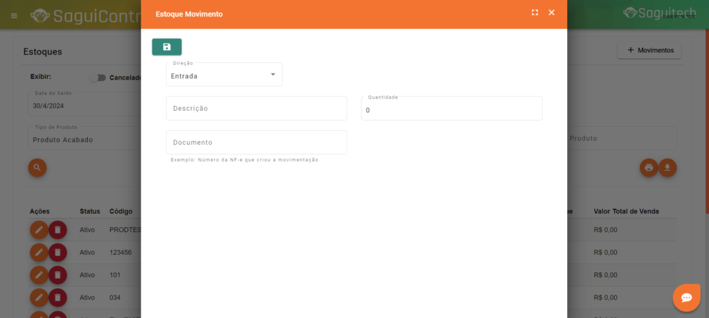 - +Movimentar: Aqui você poderá adicionar uma entrada ou saída no estoque.