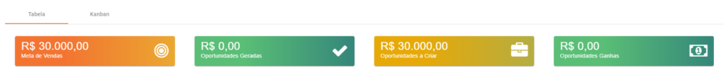 A visualização geral de oportunidades apresenta dados gerais sobre as oportunidades e metas existentes. Mantendo a seleção “Tabela”, a tabela de oportunidades será apresentada à baixo, revelando as oportunidades criadas. Selecionando “Kanban”, as oportunidades serão apresentadas em fases, revelando em qual fase a oportunidade está, e as etapas anteriores e posteriores, desta forma: