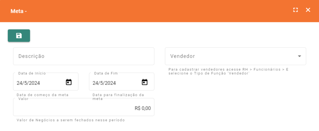 Para criar uma nova Meta clique em , uma nova tela será carregada.
