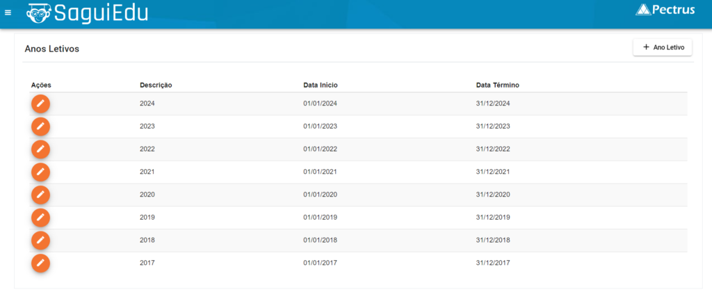 Para editar um Ano Letivo existente, clique no botão de edição em frente ao Ano Letivo desejado.