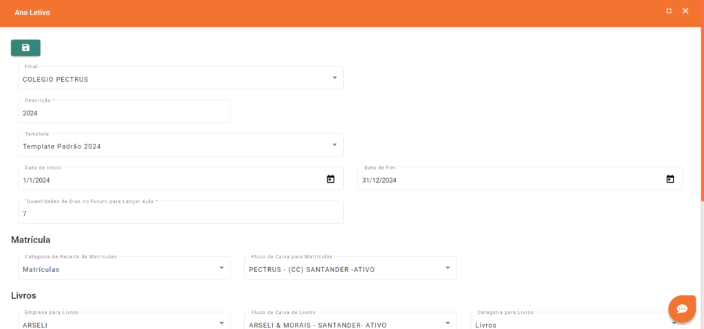 - Empresa para Livros: Filial na qual os Livros serão faturados, caso a escola venda Material Escolar;