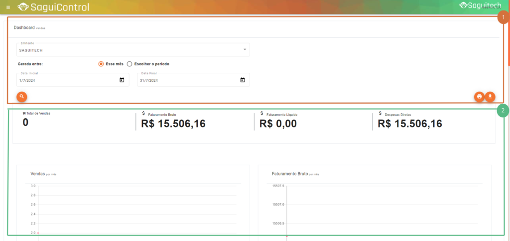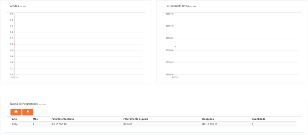 - Por mês: Apresenta por meio de gráficos o número de Vendas e o Faturamento Bruto, por mês. Ao fim dessa seção, você poderá Imprimir ou Baixar esses gráficos para melhor entendimento ou visualização do cenário, caso necessário;
