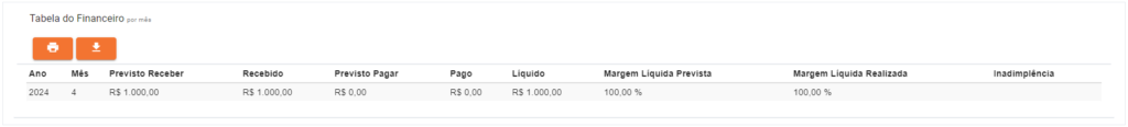Ao final dos Dashboards apresentados, será apresentada a “Tabela do Financeiro”, que apresenta em números, todos os dados fornecidos dentro de cada Dashboard. Nesta seção, você poderá Imprimir ou Baixar essa tabela para melhor entendimento ou visualização de todos os dados do cenário, caso necessário;