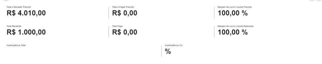 - Inadimplência Total: Soma dos valores não recebidos no período, indicando o montante de inadimplência;