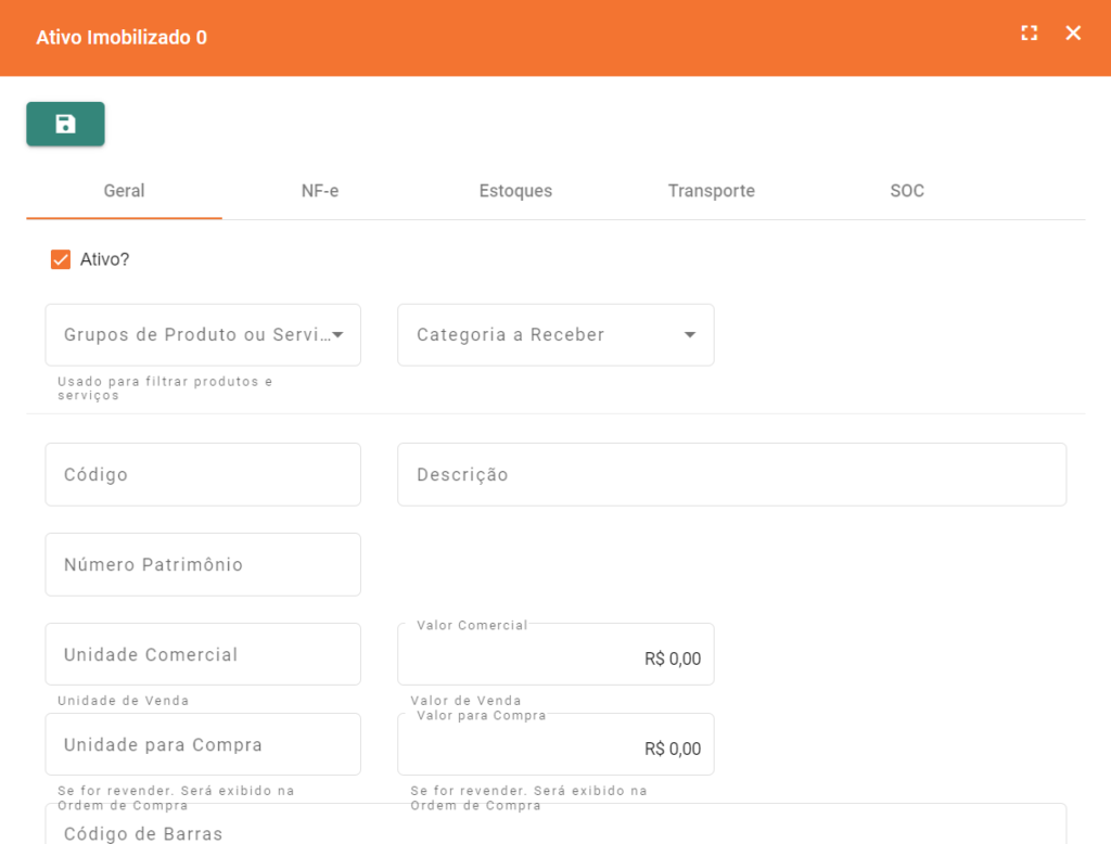 , no canto superior esquerdo da janela, assim o cadastro ou edição do Ativo ficará Salvo no Sistema.