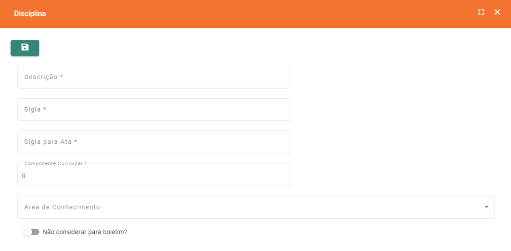 Assim que todas os campos forem preenchidos, clique em Salvar , no canto superior esquerdo da janela, assim o cadastro ou edição da Disciplina ficará Salvo no Sistema.