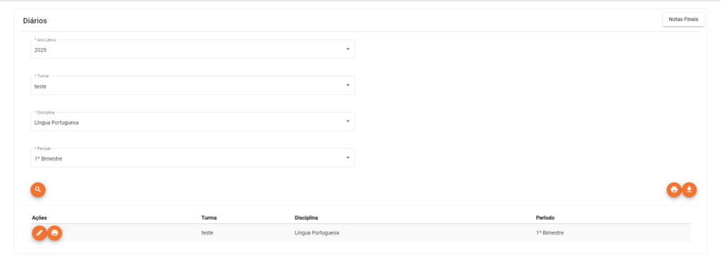 Pesquisar Diários: Botão para realizar buscas por diários específicos com base nos Filtros preenchidos acima;- Notas Finais: Carrega uma nova janela que irá exibir as notas finais dos alunos para o Ano, a Turma e o Período selecionados;