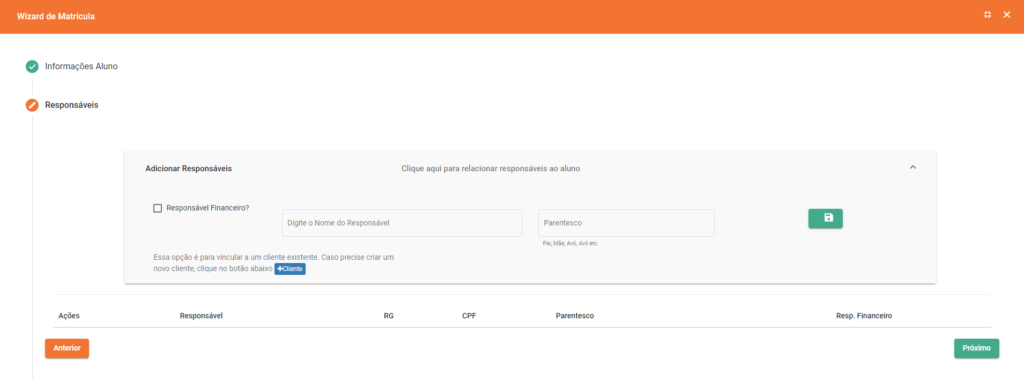 Atente-se, ao adicionar os responsáveis do aluno, em pelo ao menos um deles você deverá flegar a opção “Responsável Financeiro?”, que irá o definir como responsável financeiro.
