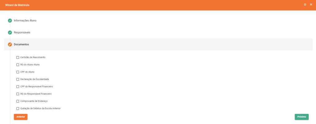 Nesta etapa você deverá flegar quais documentos foram fornecidos para o processo de Matrícula, para que a escola tenha controle sobre o dados que possuí ou não.