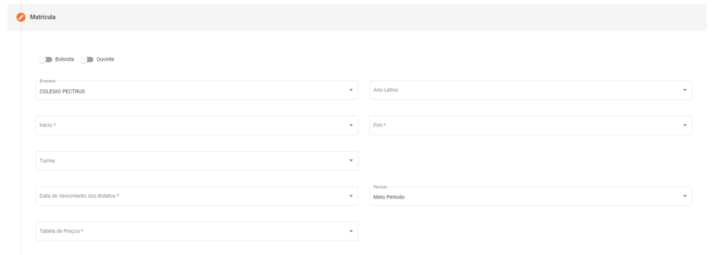 - Período: Turno das aulas (meio período ou integral) em que o aluno estará matriculado;