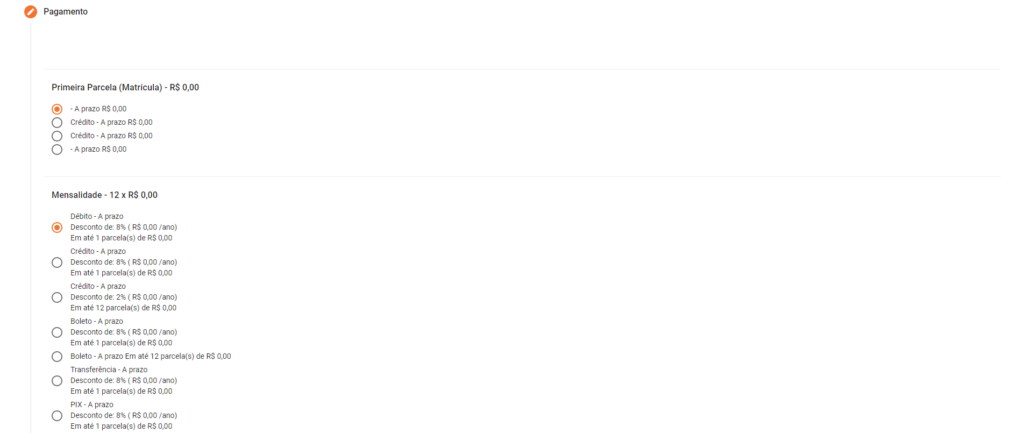 Serão disponibilizados três seções diferentes, Primeira Parcela (Matrícula), Mensalidade e Material Didático. Para cada seção você deverá flegar a opção que condiz com a modalidade de pegamento escolhida pelo responsável financeiro.