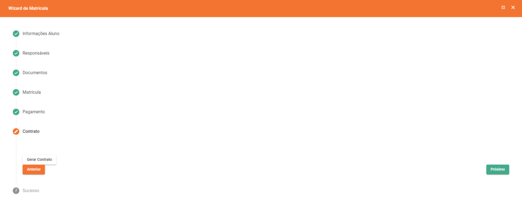 Ao clicar em “Gerar Contrato”, uma nova janela será aberta para que você crie um contrato, caso não seja necessário, você poderá seguir para a próxima etapa e concluir a Matrícula sem Gerar o Contrato.