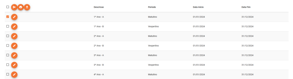 Perceba que, a primeira coluna da Tabela de Visualização de Turmas, se trata de um Campo de Seleção.